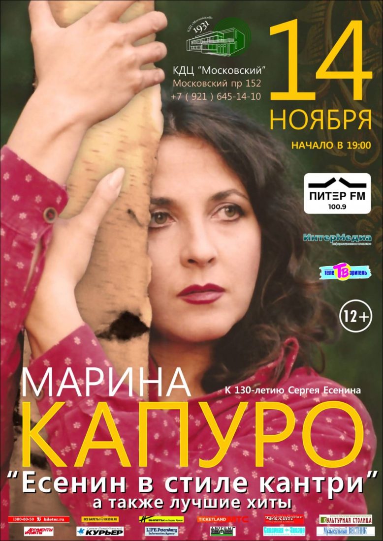 Заслуженная артистка России Марина Капуро проводит в Петербурге большой сольный концерт, в основе концерта песни на стихи поэта из нового альбома певицы «Тальяночка», презентация которого с успехом прошла на родине поэта, в государственном музее-заповеднике Сергея Есенина в селе Константиново Рязанской области.