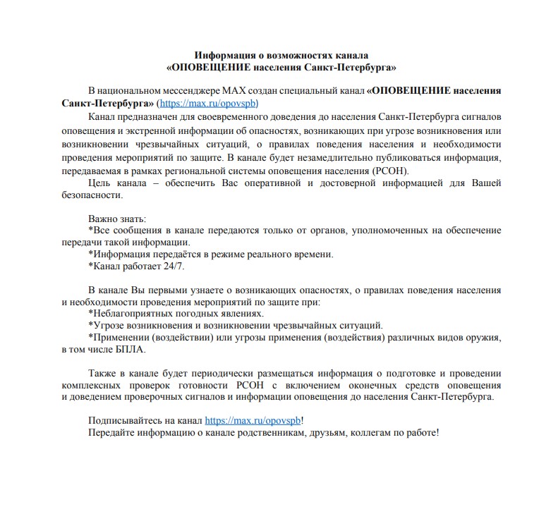 Информация о возможностях канала “ОПОВЕЩЕНИЕ населения Санкт-Петербурга” Опубликовано 25.11.2025 в рубрике Объявления для населения