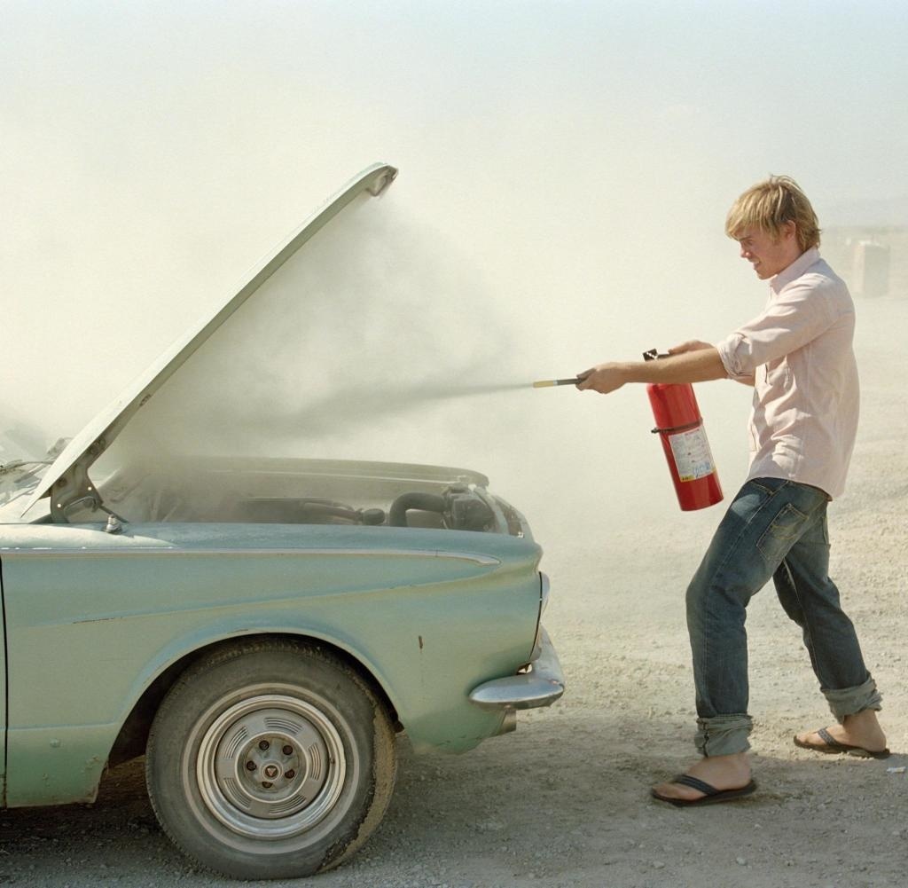 5. Если пожар начался в моторном отсеке и непонятно, какой он силы, лучше не отрывать капот и позвонить в МЧС. При попытке потушить огонь НЕЛЬЗЯ поднимать крышку капота, открывая доступ свежему воздуху. Приподнимите крышку и направьте струю огнетушителя в предполагаемую область возгорания. Лучше это делать вдвоём: один человек поднимает крышку, второй с приготовленным заранее огнетушителем тушит.